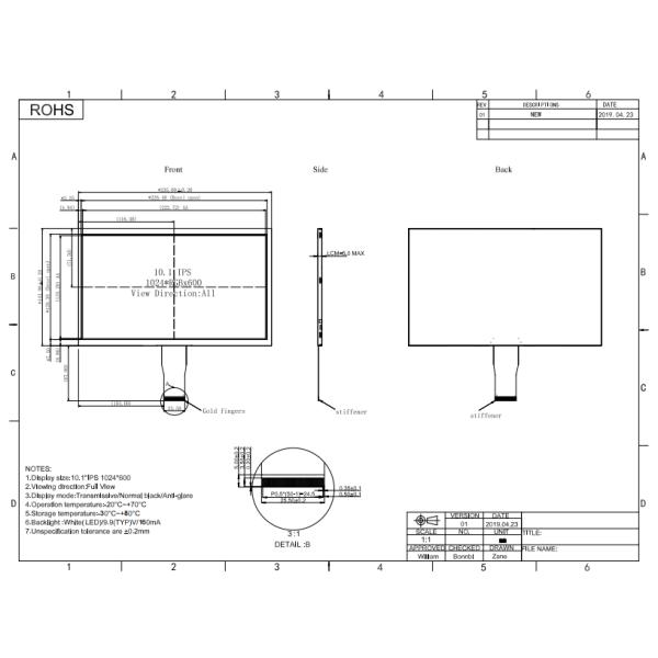 | 42 | 10.1" | HC101IZ30026-92 V.C | IPS | 1200*1920 | 164.43*254.40*4.58mm | 135.36*216.58mm | 40pinMIPI | 1000 | 280 | -10~60℃ | -10~60℃ | |